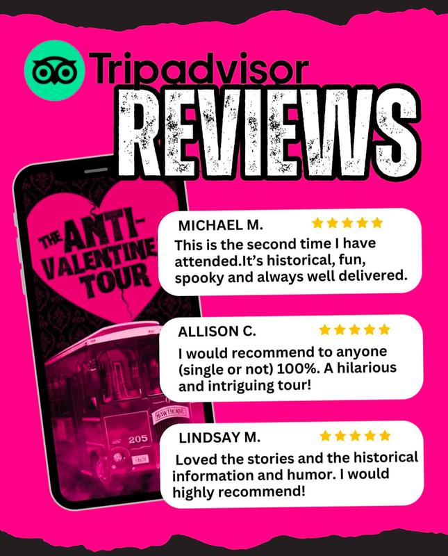 The most exciting way to spend the worst holiday is with the Salem Night Tour. With The Anti-Valentine's Tour guests can bring a Valentine, friends, or go solo with us!